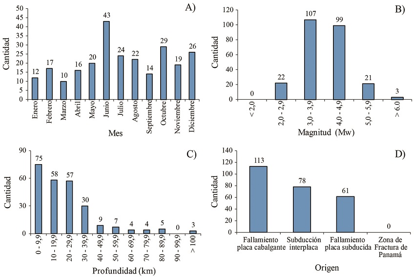 El origen de los sismos sentidos se distribuye de la siguiente manera: 113 (44,8%) fueron ocasionados por fallas superficiales en las placas Caribe y Panamá, 78 (31%) ocurrieron en la zona sismogénica interplacas a lo largo del margen Pacífico del país y 61 (24,2%) ocurrieron debido a la deformación interna de la placa del Coco al subducirse debajo de las placas Caribe y Panamá (Fig. 5D)Figure 5. El sismo de Armuelles del 25 de junio (Mw 6,4) es el ejemplo principal de los sismos originados en esa última zona.