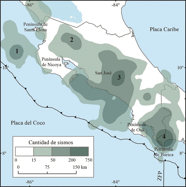 La densidad de sismos más alta ocurrió en cuatro cúmulos ubicados en el océano Pacífico al oeste de Guanacaste (Fig. 6, cúmulo 1)Figure 6, la cordillera volcánica de Guanacaste (Fig. 6, cúmulo 2)Figure 6, el sureste del Valle Central (Fig. 6, cúmulo 3)Figure 6 y una zona al norte de la península de Burica (Fig. 6, cúmulo 4)Figure 6. En las zonas de los cúmulos 1 y 2 se presentaron entre 50 y 200 sismos, mientras que en las zonas de los cúmulos 3 y 4, entre 200 y 750 sismos. Por otro lado, la Zona Norte y gran parte del Caribe y la cordillera de Talamanca se caracterizaron por una sismicidad baja, con menos de quince sismos por cada 100 km2 durante todo el año.