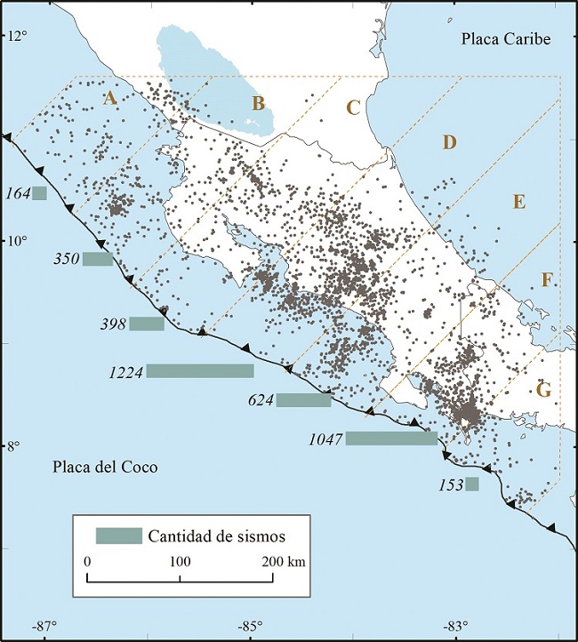 Cantidad de sismos localizados a lo largo del margen convergente costarricense, separados en franjas de 100 km de ancho.