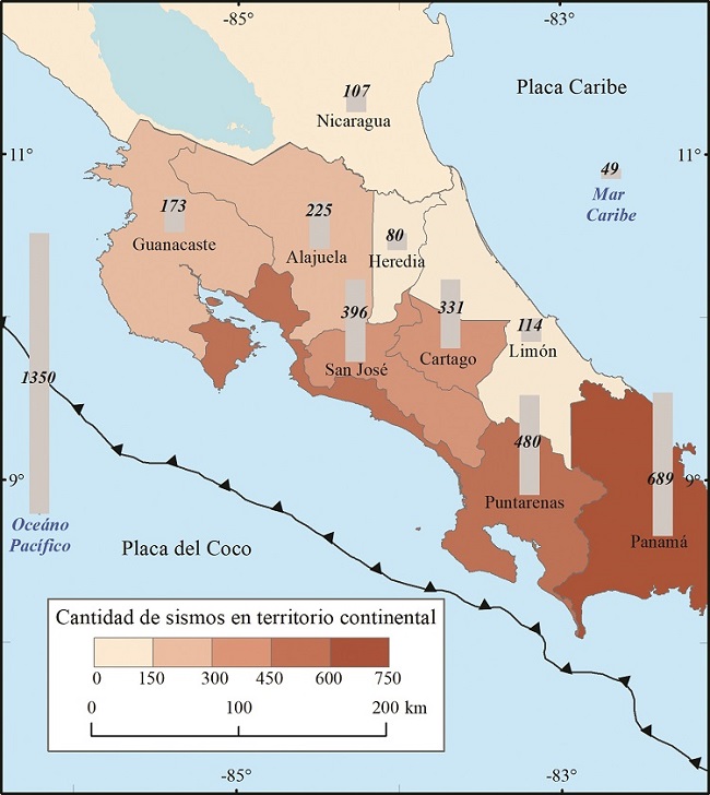 Para examinar la sismicidad por provincias y en los océanos, se contabilizó la cantidad de sismos localizados en cada zona y en Nicaragua y Panamá (Fig. 8)Figure 8. La provincia de Puntarenas fue la que presentó la cantidad más alta de epicentros, con 480. Por su parte el territorio panameño, tuvo 689 epicentros, en su mayoría las réplicas del sismo de Armuelles (Mw 6,4) del 25 junio. Además, la cantidad de epicentros ubicados en el océano Pacífico (1350 eventos) fue significativamente mayor que la del mar Caribe (49). Las provincias con menos epicentros fueron Heredia (80) y Limón (114).