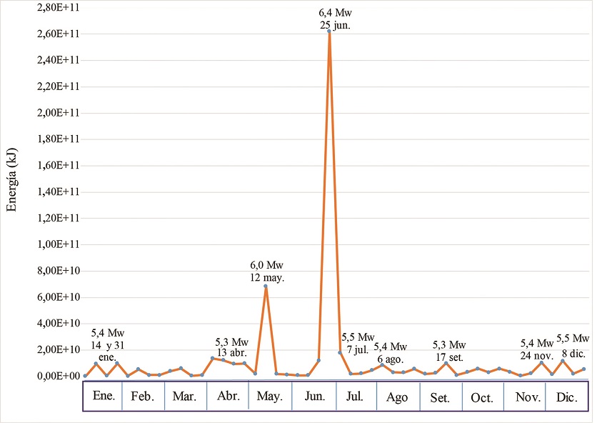 La Fig. 9 Figure 9 muestra la energía sísmica (en kilojulios, kJ) liberada por semana durante el 2019. Para su estimación, se calculó la energía de cada sismo, usando la relación desarrollada por Gutenberg y Richter (1956)[14]: log10E = 11,8 + 1,5 M, en la que la energía, E, se expresa en ergios (1 ergio = 1 x 10-10 kJ) y M es la magnitud (Spence, Sipkins y Choy, 1989)[15]. Los resultados permiten visualizar el aporte energético a través del año, resaltando los sismos más relevantes.