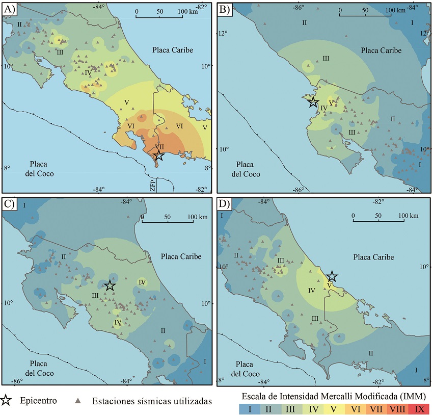 El sismo en Venecia de San Carlos del 6 de agosto y el de Cahuita del 17 de setiembre también generaron IMM sobresalientes cerca de la zona epicentral. El primero tuvo una Mw de 5,4 a 111 km de profundidad, fue sentido especialmente en la Zona Norte del país y en el Valle Central, con intensidades de III y IV (Fig. 10C)Figure 10. El segundo tuvo una Mw de 5,3 a una profundidad de 11 km y fue sentido en Limón y el Valle Central, con intensidades de V y III, respectivamente (Fig. 10.D)Figure 10.