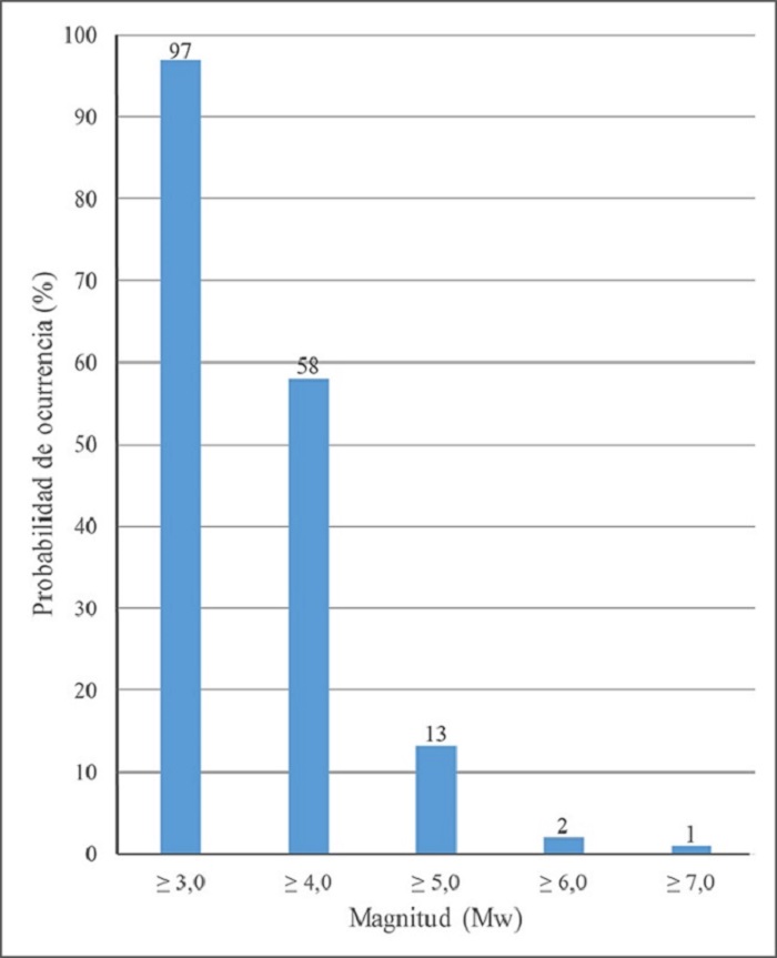Para el sismo de Armuelles se realizó el cálculo a partir del 25 de junio y hasta el 26 de junio (1 día), el 2 de julio (una semana), el 25 de julio (un mes) y el 25 de junio del 2020 (un año, Cuadro 1) Table 1. Los resultados muestran que, la probabilidad de réplicas de Mw 3,0 es muy alta (99%) desde el primer día de ocurrencia del sismo principal y hasta un año después. La probabilidad estimada para sismos de mayor magnitud fue considerablemente menor, siendo de solo 7% en el primer día para un sismo de Mw > 6,0, 10% en la primera semana, 13% en el primer mes y 20% en el primer año. No hubo ninguna réplica de tal magnitud registrada, al menos durante el primer semestre luego de la ocurrencia del sismo principal.