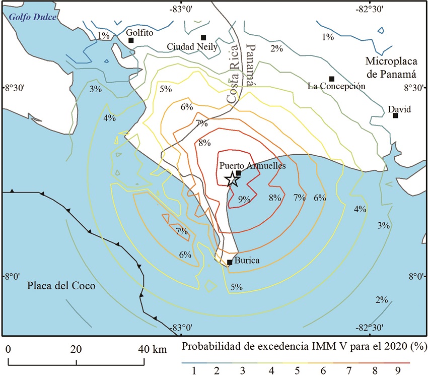 Probabilidad de excedencia de la Intensidad Mercalli Modificada V para el año 2020, asociada con posibles réplicas en la zona aledaña al epicentro del sismo de Armuelles del 25 de junio (Mw 6,4).