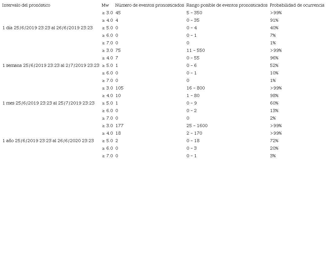 El 25 de junio a las 11:23 pm (hora local) ocurrió el sismo más significativo del año, no solo por generar altas intensidades en la zona epicentral (de hasta VII), sino por la importante actividad de réplicas que se prolongó por el resto del 2019. Utilizando el código desarrollado por OpenSHA (Open Seismic Hazard Analysis, Field, Jordan y Cornell, 2003[19]) se calculó la probabilidad de réplicas asociadas con el sismo de Armuelles. Ese programa se basa en la Ley de Omori para pronosticar la probabilidad de réplicas asociadas con los terremotos con base en su magnitud (Ogata, 1983[20]; Omi, Ogata, Hirata y Aihara, 2015[21]) y permite estimar estas probabilidades para rangos temporales de un día, una semana, un mes o un año a partir del día elegido, posterior al evento principal, para hacer el cálculo.