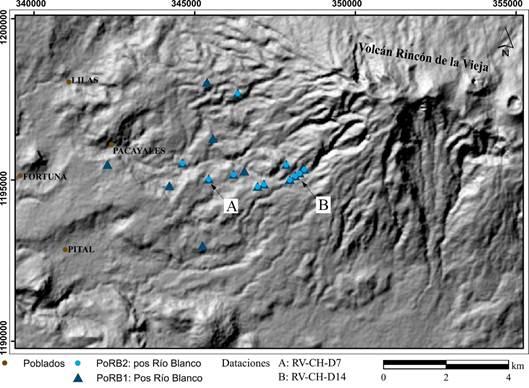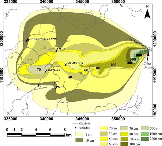 En el presente trabajo se complementó el mapa de isopacas de la capa Río Blanco con las medidas reportadas en la literatura por Kempter (1997) y Barahona et al. (2001). De ahí se escogieron los puntos que daban una lógica a las curvas de las isopacas, complementando los 54 puntos medidos en campos con los 24 de Kempter (1997) y los 25 de Barahona et al. (2001). Además, se designan las abreviaturas RB para la capa Río Blanco, PoRB1 para la capa posterior a Río Blanco, PoRB2 a la segunda capa posterior a Río Blanco y, finalmente, PrRB para el evento previo a Río Blanco, así como CDPd a la corriente de densidad piroclástica diluida.
