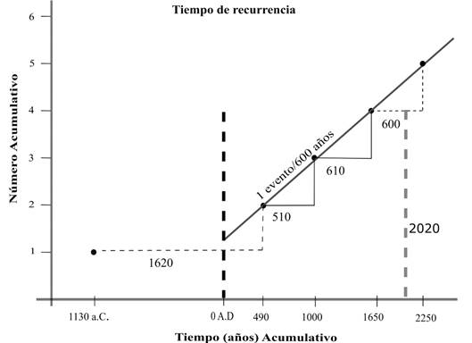 Con base en las dataciones realizadas, se definen cinco eventos volcánicos importantes que se presentaron en el Rincón de la Vieja en los últimos 6000 años (Holoceno Medio y Superior): 3650 a. C., 1130 a. C., 460 d. C., 1040 d. C. y 1650 d. C. Lo anterior amplía significativamente el calendario eruptivo prehistórico del volcán Rincón de la Vieja.