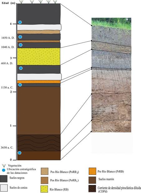 Soto (2010) indica que en las áreas medias y distales la ceniza sobreyace a la tefra RB, pero debido al rango de edad que se manejaba anteriormente (3700 a. P), lo hacía concluir que no había erupciones de importancia posteriores a RB. Sin embargo, en los estudios de campo realizados en el presente estudio durante el 2017-2018, aportan nuevos datos que restringen la edad de los depósitos más recientes, con edades más jóvenes de lo que se pensaba.