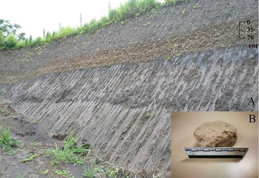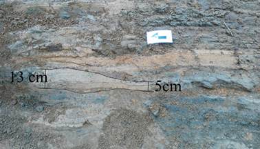 Estos eventos son anteriores a la pliniana RB. Consiste en alternancias centimétricas de cenizas grises, de grano grueso a fino, donde el espesor cambia rápidamente (15-13 cm a 5 cm) y se observan estructuras de acuñamiento (Fig. 3). Se interpreta como un posible depósito relacionado a una corriente de densidad piroclástica diluida (CDPd) tipo oleada, aunque sus estructuras no son del todo claras. Este hallazgo se da debido a un corte en profundidad de aproximadamente 5 m, desde la superficie.