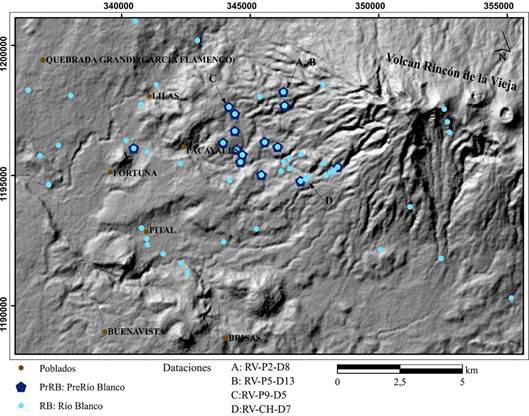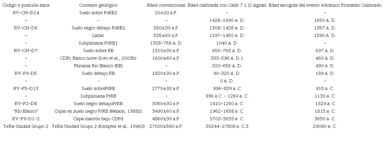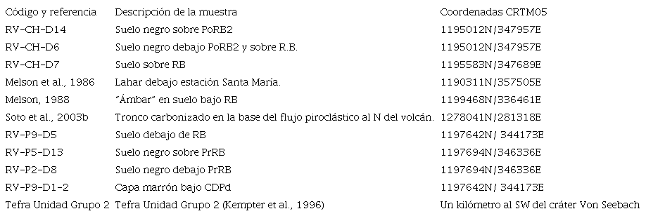 Referente a dataciones subrecientes, Kempter et al. (1996) data una muestra con 14C en 27000 ± 560 años, del lado sur del cono Von Seebach, correspondiente a la erupción explosiva más antigua datada de la fase eruptiva subreciente del Rincón de la Vieja (Tefra Unidad Grupo 2, sensu Kempter, 1997). Además, cita la datación realizada por Melson (1988) de 3490 ± 105 a. P. correspondiente a una muestra de copal (erróneamente llamado ámbar en el trabajo original) contenido en el suelo debajo del depósito de tefra Río Blanco. La edad procedente de este paleosuelo debajo de Río Blanco, como se detalla más adelante, posee un rango temporal más amplio, por lo que solo apunta a una edad máxima de la capa Río Blanco, pero no es la edad del evento explosivo (ver Cuadro 2, Fig. 2).