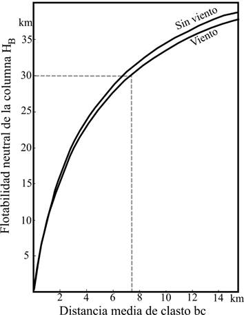 El depósito presenta dos máximos en las isopacas; uno en la parte próxima al cráter y otro máximo de 70 cm cerca del caserío de Fortuna, al pie del cerro Fortuna (Fig. 7). La integración de las isopacas muestra líneas muy distorsionadas (no regularmente ovaladas), posiblemente producto de vientos fuentes en varias direcciones (quizás hasta vientos encontrados) al momento de la erupción. Si se utiliza la Fig. 8 (Pyle, 1989) y se considera la distancia media de un clasto de 7 cm encontrado en campo a una distancia de 7,6 km de distancia del cráter (bc= 7,6), al proyectarlo, se obtiene la altura de la columna de 30 km, lo cual, sumado a las características del depósito y a su volumen, concuerda con una erupción pliniana con un VEI 5.