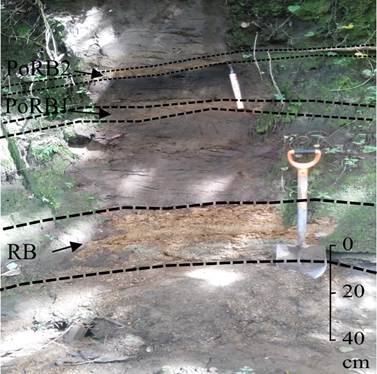 Así, se evidencian varios eventos subplinianos pos-RB. Por ello, se consideró dar seguimiento a estas capas de cenizas y pómez sobre la pliniana de RB, ya que estos eventos son más jóvenes que RB (Fig. 9). Esta secuencia consiste de varias capas de cenizas y niveles de lapilli fino de pómez muy marcados. La primera capa posterior a RB (PoRB1) tiene hasta 17 cm de espesor y capa PoRB2 llega a tener un espesor de hasta 12 cm en un corte de camino cercano al hotel Borinquen, la cual se distribuye 12 km al WSW del cráter activo (Fig. 10). Estas capas fueron datadas en 1040 d. C. y 1650 A. D y lo cual nos indica que hay erupciones más recientes e importantes posteriores a RB, por lo que se puede decir que existen otros eventos explosivos relevantes entre RB y las erupciones históricas del Rincón de la Vieja, aspecto igualmente novedoso dentro de la literatura de este volcán.