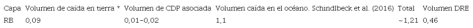 Schindlbeck et al. (2016) estima el volumen de 1,1 km3 para la capa RB en la tefra depositada en el fondo oceánico pacífico, el cual es superior al estimado por Kempter (1997) de 0,25 km3 en tierra. Ahora, con los datos nuevos recolectados, junto con los de Kempter (1997) y Barahona et al. (2001), todos ellos sirven para dar cierre y detalle a los valores proximales a distales al cráter, por lo que se puede realizar una mejor estimación del volumen eruptado. De la integración de los espesores en tierra, el volumen sería de 0,09 km3 (muy inferior al estimado originalmente). Para calcular el volumen de roca densa equivalente (DRE en inglés) se asume una densidad del depósito de 1000 kg/m3 y una densidad del magma dacítico de 2600 kg/m3 y utilizamos el valor del volumen total, lo que nos da un valor de volumen DRE de 0,46 km3 (Cuadro 3).