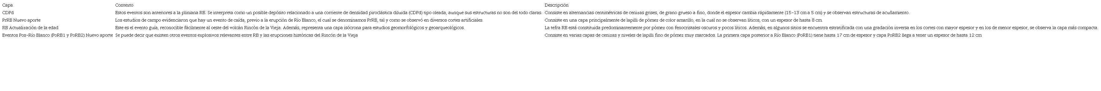 Mediante el estudio detallado de afloramientos al suroeste del volcán Rincón de la Vieja, en nuevos cortes realizados para las plataformas de pozos geotérmicos del proyecto Borinquen y en sus alrededores (caminos), así como algunos de los puntos de la literatura, se reconocieron tres capas de pómez subplinianas adicionales a la capa pliniana Río Blanco, estudiada por Kempter (1997) y Soto et al. (2003a), las cuales se encuentran sobre e infrayaciendo a la capa Río Blanco. Estas capas no habían sido aún reconocidas o adecuadamente descritas en la literatura. También, se complementó con más localidades los datos de espesores de la capa pliniana Río Blanco para una mejor evaluación de su extensión y volumen.