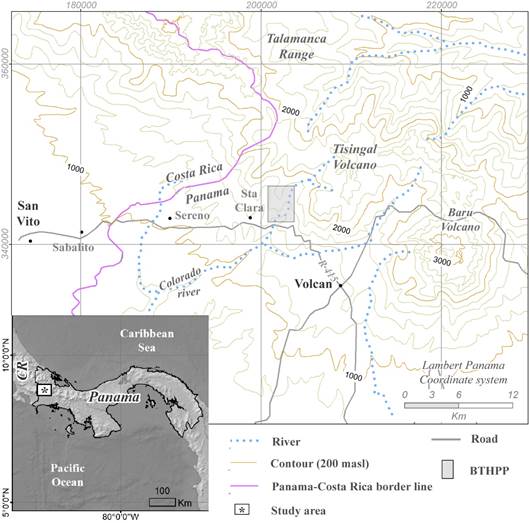 Bajos de Totuma Hydropower Plant (BTHPP) study area is located in west Panama, near to Costa Rica-Panama border line (Fig. 1), the project area is located on the north side of national road 415 some 25 km west from the town of Volcán. The region is part of the Talamanca Mountain Range, where the Tisingal and Tisingal volcanoes stand out and BTHPP develops on southwest flank of the Tisingal volcano.