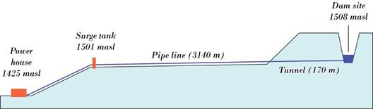 The hydraulic scheme of the project includes a small intake in the Colorado River at elevation 1,508 m.a.s.l., an initial conduction tunnel about 170 m long, a superficial pipeline about 3140 m, pressure tank, an approximately 600 m long penstock, a powerhouse located on the right bank of the Colorado River at 1,455 m.a.s.l (See schematic elevation on figure 2) elevation and generates around 5 MW of power.