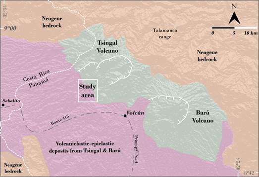 The study area (Chiriquí highlands) is composed mostly by Neogene to Quaternary age volcanic and sedimentary rocks. The most prominent volcanic range (that is an eastward extension of Costa Rican Talamanca range) includes the Colorado-Tisingal and Tisingal complex volcanoes, which are among the highest mountains in Panama and most of the rock formations in the area are derived from these groups of volcanic complex activity. Older volcanic and sedimentary rocks in the area are from early Pliocene age and probably older Paleogene, according to Geological Map of Panama, 1991. Those formations include andesitic lavas, breccias, and felsic to intermediate intrusive bodies in form of intravolcanic batholiths and dikes (Camacho, 2009) and sedimentary rocks associate with neritic sedimentation during Upper Miocene.