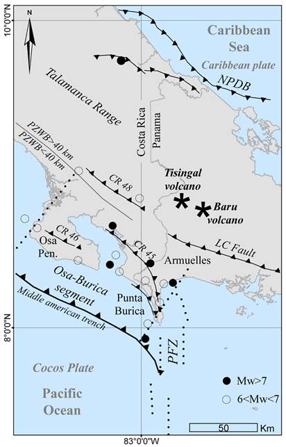 As shown, major earthquakes (Mw>6) are located along Panama Fracture Zone and associated to the subducted portion of Cocos Plate beneath the Caribbean Plate in the west side of PFZ. Table 1 lists historic earthquakes that can be related to PFZ, as stated by Camacho (2003).