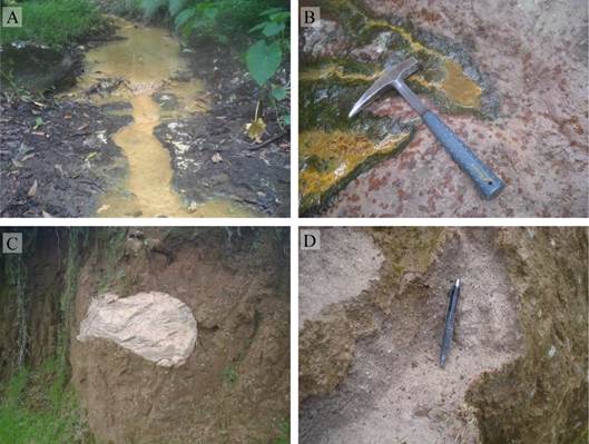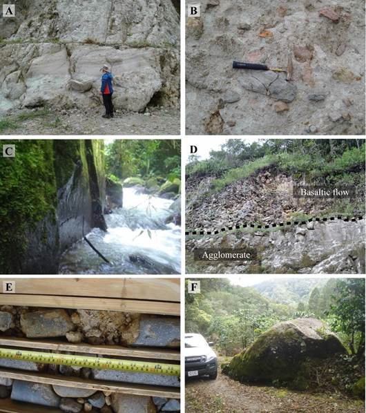 The agglomerate (is the) unit (that) outcrops in all the extension where the conduction pipe and part of the tunnel is located, it is composed by a well welded sandy matrix of medium granulometry, which includes blocks of up to 1 m in diameter, with varied composition , being the granodiorite blocks those that occur with greater frequency (figure 7 A and 7B).It was observed that the previous unit is overlying by a basaltic lava flow, which filled the preexisting topography and appears in the upper part of the study area, where it was installed. This flow is composed of basalts of dark tonality, with columnar disjunction, aphanitic texture and in general with very little evidence of alteration (figure 7C and 7D). Over these materials it was observed, especially in the lower part of the study area, where the power house will be installed, a colluvial-alluvial deposit, with blocks up to 5 m in diameter, which suggests a very high energy environment, with a clayey matrix and with a thickness greater than 20 m (figure 7E and 7F).