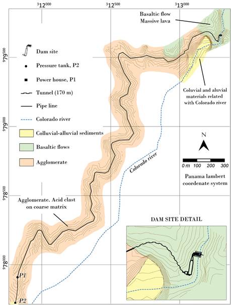 Resumen: El área de estudio del Proyecto Hidroeléctrico Bajos de Totuma está localizada al oeste de Panamá, en las cercanías de la línea fronteriza entre Panamá y Costa Rica. El esquema hidráulico del proyecto incluye una pequeña toma en el río Colorado, una conducción inicial, tubería de conducción, tanque de oscilación, tubería de presión y una casa de máquinas y genera 5 MW de poder. El proceso de subducción en el sur de la zona es complejo, sobresaliendo estructuras como la zona de fractura de Panamá, dorsal de Cocos y volcanes Tsingal y Barú. El área de estudio está compuesta principalmente por un basamento rocoso del Paleógeno-Neógeno, y materiales volcánicos Cuaternarios originados en la cordillera volcánica del oeste de Panamá (volcanes Barú y Tsingal, los cuales son las montañas más altas de Panamá). Varios tipos de rocas volcánicas están presentes a lo largo del esquema del proyecto, es muy probable que la mayoría de esos materiales se hayan originado durante la actividad explosiva mayor del volcán Tisingal hace unos 1,6 millones de años y probablemente la mayoría de las rocas de la zona son alóctonas y relacionadas a una explosión lateral, resultando en un flujo piroclástico. A pesar de las principales incertidumbres estratigráficas, esta investigación contribuye a una comprensión de las condiciones y parámetros geotécnicos presentes en cada trabajo propuesto del proyecto, esto es, toma, túneles, tuberías de conducción, tanque de oscilación, compuerta y casa de máquinas.