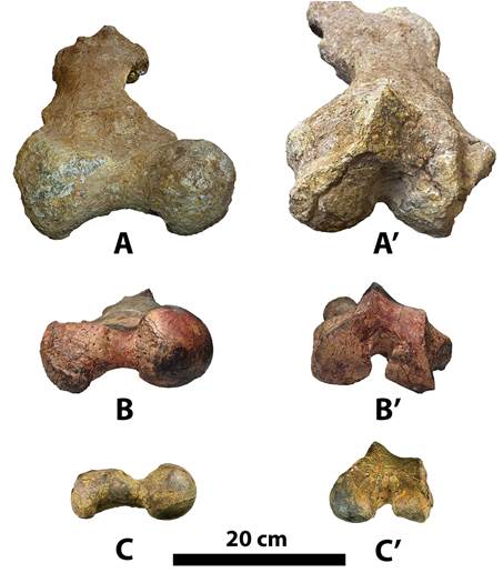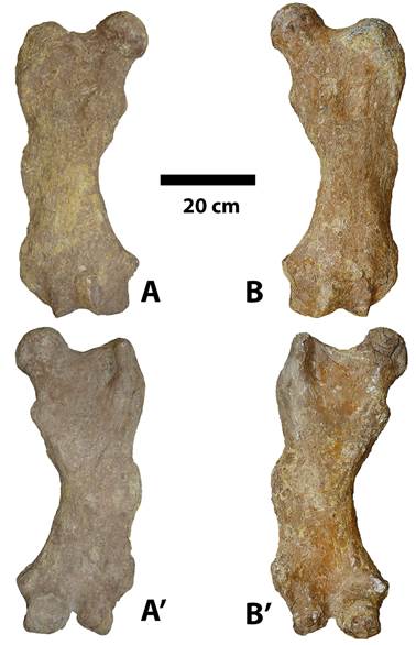 Features shared by the femora of Magdalenabradys confusum (= Pseudoprepotherium confusum) and Magdalenabradys kolossiaia (= Bolivartherium urumaquensis, in partim) and differ from those for Pseudoprepotherium venezuelanum include the expansion of the lateral margin of the proximal end so that is has a more pronounced convex surface than in P. venezuelanum. The valley between the head and the greater trochanter in P. venezuelanum is shallow, but deeper and more pronounced in the other two taxa. The lesser trochanter is not as developed in P. venezuelanum as in the other two taxa, and the medial margin of the diaphysis is straight between the lesser trochanter and the medial epicondyle, while in M. confusum and M. kolossiaia this area is concave. The muscle scar for the medial vastus muscle is more pronounced in P. venezuelanum, but neither of the muscle scars for the vastus muscle is developed in the other taxa. The width across the distal epicondyles is less than the width of the proximal end in P. venezuelanum, so the femur has a tapered appearance distally, while in M. confusum and M. kolossiaia, the width across the epicondyles and the proximal end are the same. The area distal to the medial epicondyle is laterally expanded in M. confusum and M. kolossiaia while in P. venezuelanum it is narrow, so the patellar surface is centered, whereas in the other two taxa it appears positioned more laterally. The third trochanter in P. venezuelanum has a prominent lateral projection, while in the other two taxa it projects more posteriorly. The lateral epicondyle of P. venezuelanum is less developed and lacks the pronounced lateral projection present in the other two taxa. (Fig. 1A, 1B, 4C’).
