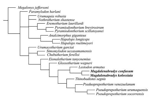 The recent phylogenetic hypothesis of the relationships of the northern South America Mylodontidae from the Miocene proposed by Rincón et al. (2015a) resulted in a paraphyletic relationship of P. confusum and P. venezuelanum. In that analysis P. confusum, nested with B. urumaquensis based on the referred material (left and right femur, pelvis and some vertebrae associated, of a single individual), assigned to that taxon by Carlini et al. (2006a) and not with P. venezuelanum. While the femur is from a mylodont, since the remains do not have any common element comparable with the type of Bolivartherium urumaquensis, an associated skull and mandible, there is no a priori reason to refer this specimen to Bolivartherium. Boscaini et al. (2019, Figure 4) recovered a close relationship between Pseudoprepotherium venezuelanum, P. confusum and Mirandabradys spp., with Urumacotherium as the sister taxon, but that analysis is based on the assumption that the cranium of P. venezuelanum is similar to that of P. confusum of Hirschfeld (1985) which cannot yet be confirmed because cranial remains for P. venezuelanum are not yet known, resulting in an artificial relationship with the other taxa for which cranial remains are known. Our analysis presented here confirms this relationship and additionally that Pseudoprepotherium confusum, is distinct from P. venezuelanum and cannot be referred to that genus. Based on the analysis presented here the type specimens of Pseudoprepotherium venezuelanum nests with Mirandabradys from Urumaco. Therefore, we consider Mirandabradys of Carlini et al. (2006a) to be a junior subjective synonym of PseudoprepotheriumHoffstetter (1961). We therefore propose a new genus for the species as a new combination. Magdalenabradys confusum along with the post-cranial material from Venezuela previously included in B. urumaquensis to the new genus Magdalenabradys.