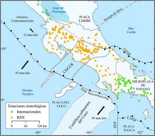 Los sismos son fenómenos muy frecuentes en el territorio costarricense debido a su ubicación en una zona donde limitan cinco bloques tectónicos: las placas del Coco, Caribe y Nazca, la microplaca de Panamá y el Bloque Antearco Centroamericano (Fig. 1). La subducción de la placa del Coco inicia en la fosa Mesoamericana y ocurre a velocidades de 83-89 mm/año (DeMets, Gordon, Argus y Stein, 1994). Al sureste del país, se encuentra un punto triple donde se unen la fosa Mesoamericana y la Zona de Fractura de Panamá (ZFP), esta última limitando las placas del Coco y Nazca. El límite entre las placas Caribe y Panamá ocurre en el Cinturón Deformado del Centro de Costa Rica (CDCCR; e.g., Marshall, Fisher y Gardner, 2000; Montero, 2001) y en el Cinturón Deformado del Norte de Panamá (CDNP; Adamek, Frohlich y Pennington, 1988). Además, en el norte de Costa Rica, a lo largo de las fallas del arco volcánico, el Bloque Antearco Centroamericano se mueve hacia el noroeste con velocidades de 11 mm/año (Franco et al., 2012).