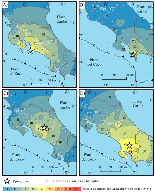 Los sismos que generaron las intensidades más altas fueron el de Jacó del 24 de agosto (Mw 6,0; Fig. 10A), el de Burica del 4 de setiembre (Mw 5,7; Fig. 10B), el de San José del 31 de octubre (Mw 5,6; Fig. 10C) y el de Boruca del 6 de marzo (Mw 5,6; Fig. 10D).