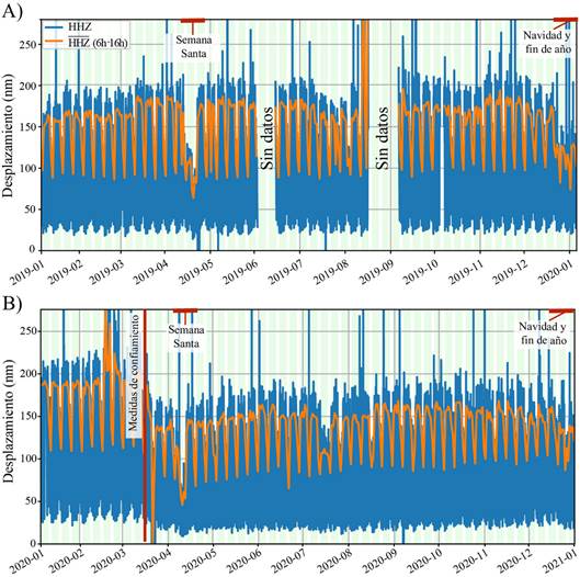 Las figuras 11 y 12 expresan el nivel del desplazamiento del suelo medido en nanómetros (nm) a través del tiempo. En particular, la figura 11 muestra el desplazamiento en el eje vertical y el tiempo en el eje horizontal. La línea anaranjada representa el promedio del desplazamiento registrado, el cual usualmente tiene su máximo durante las horas del día, cuando hay más ruido sísmico, y su mínimo durante las noches, porque estas suelen ser quietas. Esto se representa como un vaivén diario (de arriba abajo) de la línea anaranjada con el tiempo. Además, el nivel de ruido es también menor durante los fines de semana, por lo que existe también un vaivén con un periodo semanal. En el gráfico, además, se ha marcado en el eje horizontal el periodo de las vacaciones de Semana Santa y Navidad para los años 2019 y 2020 y el inicio de las medidas de distanciamiento social del 16 de marzo del 2020. De esta forma, se puede apreciar y correlacionar claramente los periodos de tiempo en los cuales el nivel de ruido fue menor.