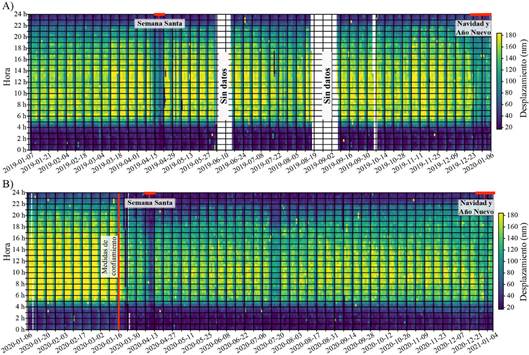 En la figura 12 se muestra en el eje vertical la hora del día, en el eje horizontal el periodo de tiempo analizado y con colores el nivel del desplazamiento, siendo el azul el nivel menor (< 40 nm) y el amarillo el nivel máximo (160-180 nm). Este gráfico permite ver claramente la quietud de la noche (colores azules, como zonas horizontales entre las 10 p.m. y 5 a.m.), la relativa quietud de los fines de semana (como barras azules verticales que se alternan periódicamente) y el ajetreo del día a día (en colores amarillos). Nuevamente, se etiquetan los periodos de vacaciones de la Semana Santa y Navidad y el inicio de las medidas de distanciamiento social el 16 de marzo del 2020.