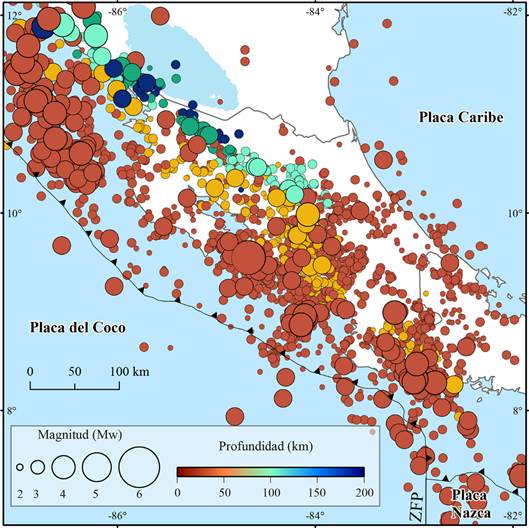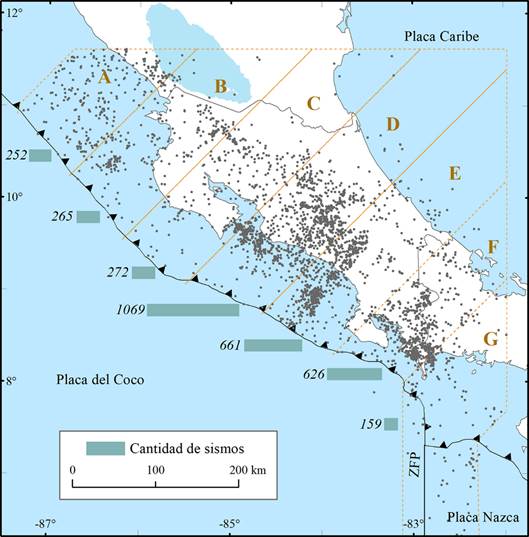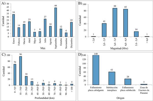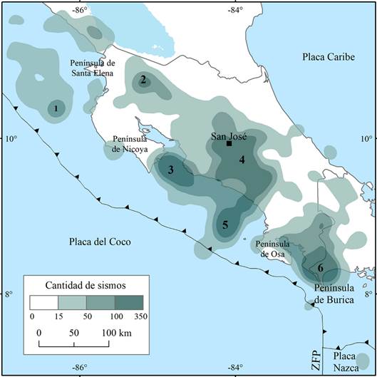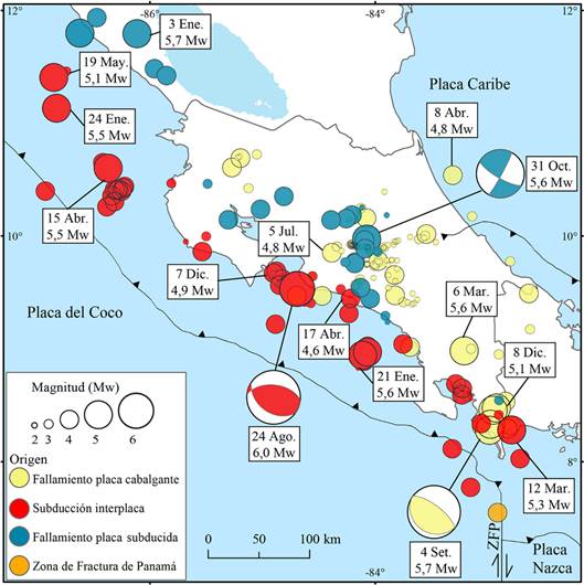 El origen de los sismos sentidos se distribuye de la siguiente manera (Fig. 4): 140 (~60%) fueron ocasionados por fallas superficiales en las placas Caribe y Panamá, 61 (~26%) ocurrieron en la zona sismogénica interplacas o en la zona del levantamiento (outer rise) a lo largo del margen Pacífico del país , 28 (~12%) ocurrieron debido a la deformación interna de la placa del Coco al subducirse debajo de las placas Caribe y Panamá (Fig. 5D) y tres (~1%), se asocian con la ZFP.
