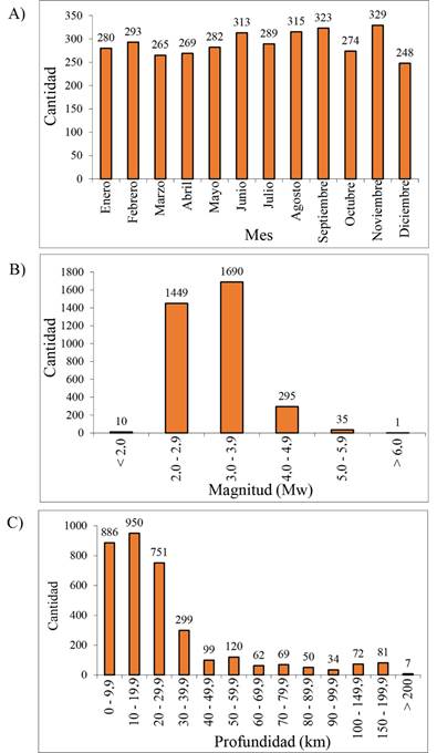 Los meses con la mayor cantidad de sismos locales fueron noviembre (329), septiembre (323), agosto (315) y junio (313). Por otro lado, el mes de diciembre tuvo la menor cantidad de sismos localizados, con 248 (Fig. 3A). Los demás meses tuvieron una cantidad de sismos que varió entre 265 y 293 (Fig. 3A). El promedio mensual de sismos registrados fue de 290.