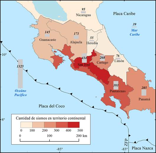 Con el fin de examinar la sismicidad en las provincias y los océanos, se contabilizó la cantidad de sismos localizados en cada zona y además en Nicaragua y Panamá (Fig. 8). La provincia de San José fue la que presentó la cantidad más alta de epicentros, con 434, seguida por Puntarenas con 393. Las provincias con menos epicentros fueron Heredia con 55 y Limón con 76. La parte del territorio panameño cercana a Costa Rica tuvo 285 epicentros, mientras que Nicaragua solo 95. Finalmente, la cantidad de epicentros ubicados en el océano Pacífico (1325 eventos) fue significativamente mayor que la del mar Caribe (39).