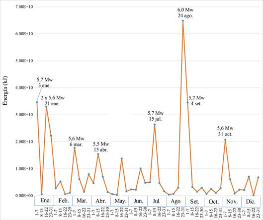 Usando la correlación clásica entre Mw y energía sísmica E en ergios (1 ergio = 1x10-10 kJ) log10E = 11,8 + 1,5 Mw (Stein y Wysession, 2003) y tomando en cuenta la energía sísmica total aportada por los 3480 sismos locales del año 2020, se determinó que el valor de energía sísmica promedio liberado cada semana fue de 8,35x109 kJ, es decir, el equivalente a un sismo de magnitud 5,4.