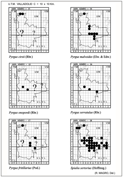 Pyrgus serratulae (Rbr.), en tres cuadrículas, parece ser muy escasa y rara, acaso porque son pocas la zonas de Valladolid que superan los 900 metros de altitud, límite de vuelo estipulado en la bibliografía por varios autores.