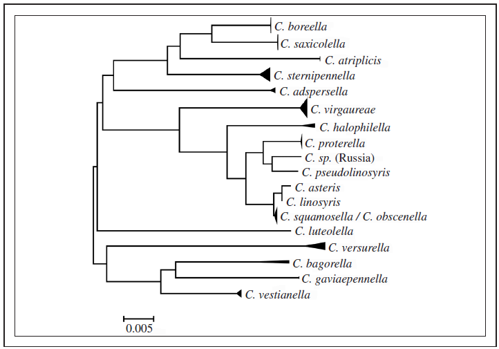 Molecular diagnosis: 9 studied DNA samples of C. proterella sp. n. display a 0.06% mean K2P intraspecific variation, whereas C. virgaureae (n=14) shows 0.09% and C. squamosella (n=9) 0.0% mean variation. The mean interspecific divergence between C. proterella sp. n. and other in genitalia similar species is 1.16% - 4.3% (Table 1, Fig. 1). Although the interspecific difference between C. proterella sp. n. and C. squamosella is markedly lower than on average on Coleophoridae, it correlates perfectly with morphological features and bionomy and supports the status of C. proterella sp. n. as a distinct species. It is worth noticing that three Aster-feeding species, viz. C. obscenella, C. linosyris E. M. Hering, 1937 and C. asteris Mühlig, 1864 have very similar or identical barcode sequences with C. squamosella. At present there exist no DNA barcodes for C. cinerea in the BOLD.