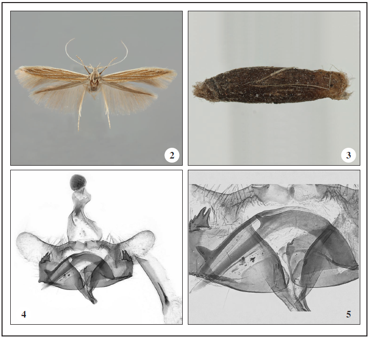 2. Imago, female, holotype. 3. Larval case. 4-5. Male genitalia (GP 412 JT, paratype), “Finland, ES: Enäjärvi, e. l. 1989”.