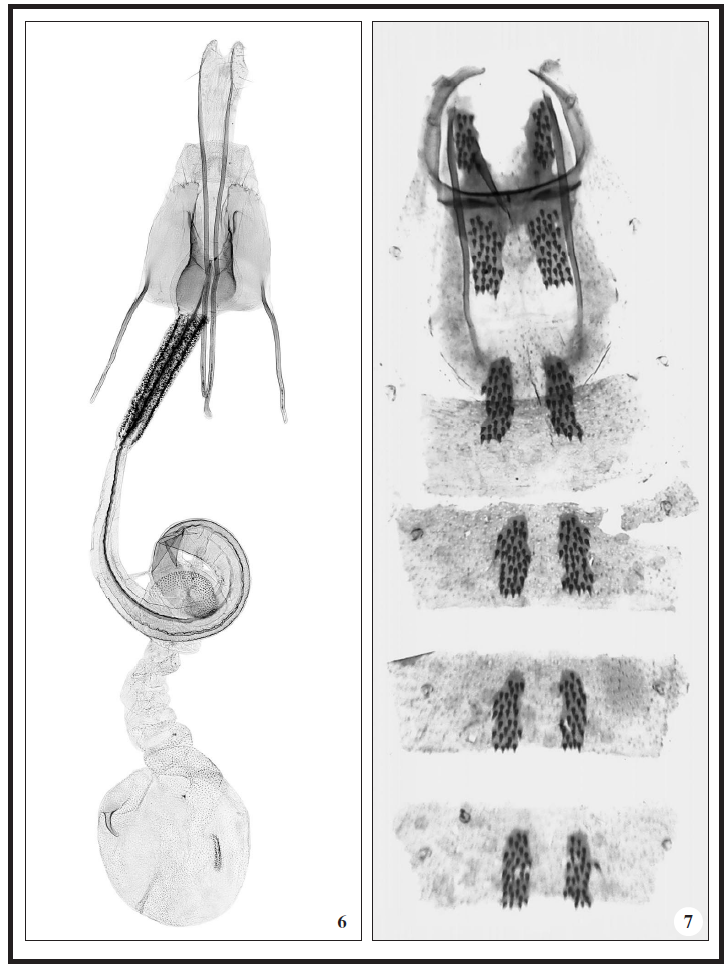 Tergal sclerites about 3x longer than wide (3rd tergum), each covered with 30-35 conical spines Male genitalia (Figs. 4-5). Gnathos knob oval. Tegumen narrow, pedunculi rather long. Transtilla broad. Cucullus broad, ear-shaped, basally slightly narrower. Valvula as broad as cucullus, subtriangular, ventrally rounded, outer margin well delineated, densely covered with bristles. Sacculus broad, ventral margin almost straight, tooth at ventral angle distinct, lateral margin long, vertical, shallowly serrate; dorsal process long, two-pointed, inner tooth longer, extended to middle of cucullus. Phallotheca with two strongly sclerotized, slightly arched rods; upper rod bears one subapical tooth, and the lower rod bears one basal tooth at the junction of the rods. In vesica one needle-shaped cornutus with a basal plate.