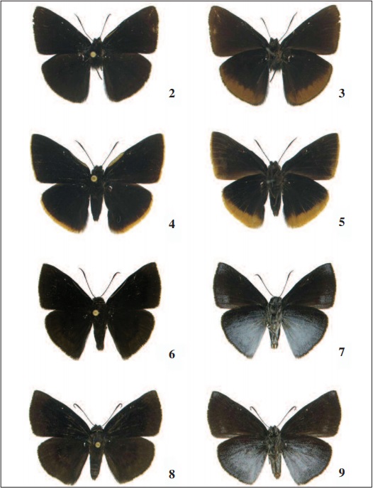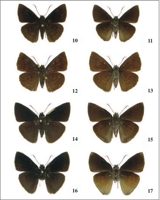 Descrição: Macho (Figs. 4, 5). Comprimento da asa anterior - 21-24 mm. Vértice, antenas, olhos, genas, palpos, tórax, pernas e abdome, inclusive ventralmente, marrons, quase negros.