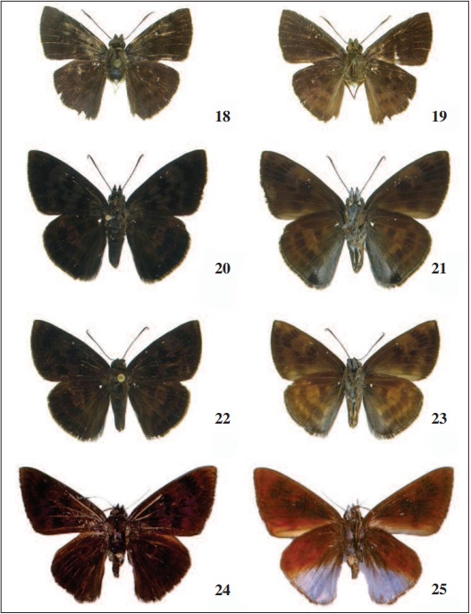 Fêmea (Figs. 8, 9,37): Comprimento da asa anterior - 20-21 mm. Semelhante ao macho, porém os desenhos da face dorsal das asas pouco mais marcados.