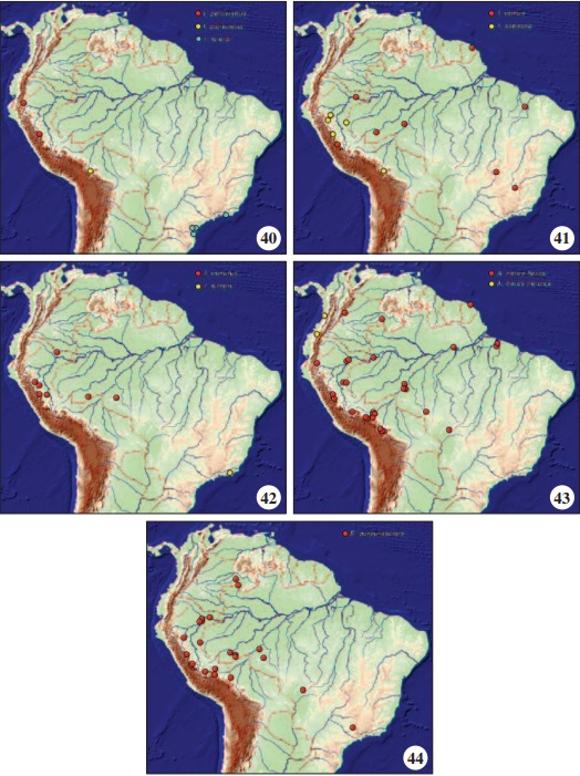 Distribuição geográfica (Fig. 44): Venezuela: Amazonas (San Carlos - III, Yavita - IX) (OM). Perú: Cuzco (Poyentinari - IX) (MUSM); Huánuco (Tingo María - II, X, XI) (OM); Junín (Chanchamayo, Perené) (NHMUK, OM); Loreto (Iquitos, Pebas, Picuroyacu - X, Zona Reservada Allpahuayo-Mishana - XI) (NHMUK, MUSM, DZUP); Madre de Dios (Alto Río Madre de Dios - aproximadamente 1,5 KM a NO de Atalaya, Cuzco - Albergue Amazonia - IV, V, X, XI, Parque Nacional del Manu - X) (OM, DZUP, MUSM); Puno (Zona Reservada Tambopata-Candamo - III) (MUSM); San Martín (Juanjui - V, VIII, Tarapoto) (OM); Brasil: Acre (Bujari - VII, IX, Mâncio Lima - Parque Nacional da Serra do Divisor - VI, VIII, Porto Acre - Reserva Humaitá- IX, Senador Guiomard - Reserva Catuaba - IX) (OM, DZUP); Rondônia (Cacaulândia - VII, Candeias do Jamari - VII) (OM); Mato Grosso (Pantanal) (ZUEC); São Paulo (Casabranca - localidade duvidosa) (OM).