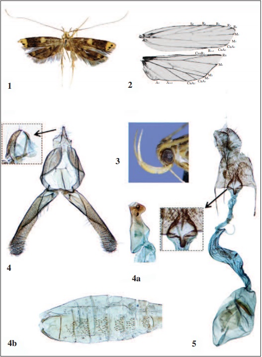 Description: Male and female. Adult (Fig. 1).Wingspan 13.0-15.0 mm. Head with light yellow, shiny appressed scales anteriorly and dorsally, with some brown, shiny scales posteriorly. Basal segment of antenna elongate, yellowish brown dorsally, yellowish white ventrally; flagellum yellowish brown with darker annulations in basal third, then yellowish white with obscure annulations. Second segment of labial palpus (Fig. 3) thickened, upturned, more than twice the diameter of compound eye, orange gray, darker toward apex; 3rd segment yellowish brown, slender, shorter than second segment, with acute apex. Tegula covered with yellowish brown scales anteriorly. Thorax yellowish brown dorsally. Mid tibia pale yellow, with yellowish brown band apically; tarsi pale yellow. Hind tibia with short, setae above; tarsi pale yellow. Forewing densely covered with yellowish brown scales throughout, with large, more or less trapezoidal, light yellow patch near end of cell, and broadly occupied with light yellow zone beyond subterminal line; subterminal line gently concave inwardly; costa slightly arched near base then nearly straight to before apex, three large yellowish brown spots along termen, first one ovate, second one trapezoidal, third one smallest, subtriangular; venation (Fig. 2) with R1 arising from near middle; R2 arising from near upper corner of cell; R3 and R4 stalked before middle; R4 to costa; R5 absent; M2 absent; M3 stalked with CuA1+CuA2 at basal 1/5; CuA1 stalked with CuA2 at basal 1/8; cell closed; apex obtuse; termen oblique, not sinuate; fringe grayish yellow in basal half and yellowish brown beyond. Hindwing yellowish brown, pale yellow streak extended from base to before middle, costa nearly straight to apex; apex sharply produced; fringe concolorous, with narrow pale grayish yellow basal line; venation with Rs and M1 stalked near 3/5 cross of wing; M2 weakly developed, arising from about 2/5 cross of wing; M3 and CuA1 stalked beyond middle; cell short, less than half of wing.