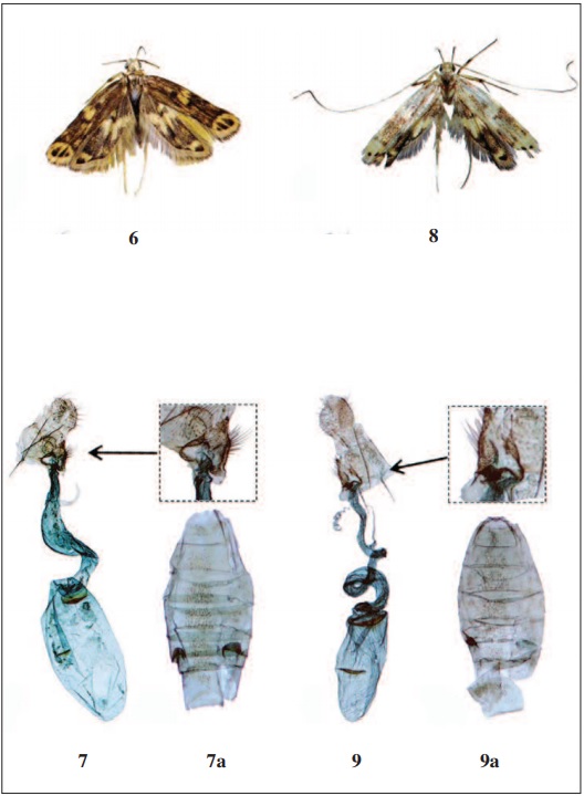 Female genitalia (Fig. 7): Abdominal tergites with spinous zones, with pocket-like membranous sacs in 5th segment laterally (Fig. 7a); abdominal sternite VII deeply emarginated medially, with dense setae. Apophyses anteriores slightly shorter than half of apophyses posteriores. Ostium heart-shaped. Ductus bursae broadened medially, as long as corpus bursae; ductus seminalis arising from about distal 1/5 of ductus bursae. Corpus bursae ovate, with a pair of signum transversally elongated; distal one larger, half- moon-shaped, as wide as 1/3 of widest part of corpus bursae, smaller one in middle with strong central ridge, about 1/2 width of distal one.