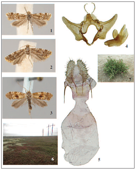 Bionomy: All specimens of the new subspecies have been collected in the Crimea in wet (sometimes pounding in winter time) salines. The habitats are strongly restricted with Salicornia europaea L. (Chenopodiaceae) community (Fig. 6). The last plant is most likely the host for the larvae of the new subspecies (Fig. 7). Adults fly in two generations: from second decade of May to mid June and again in August. The hibernating stage is unknown. Considerable long-term fluctuation of the species abundance has been observed: a large number of specimens were registered in 2006-2007, no specimens were observed in 2008-2013 in spite of the permanent collections in their habitats. The species appeared again in 2014 but was not abundant.