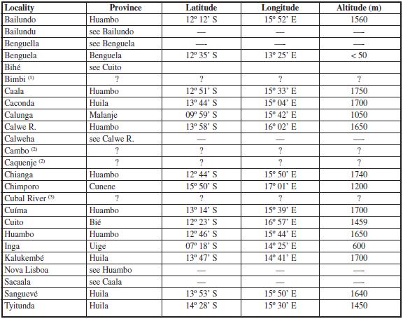The approximate coordinates of the localities from where the studied specimens proceed are listed behind; they are close to the assigned towns/villages and were in their majority previously presented by MENDES et al. (2013). When the name of a locality has changed or when it appears wrongly spelt in previous contributions or labels, the old or the incorrect name will be remitted to the new or to the corrected one. Each locality is assigned to the recent administrative province it belongs to, as well as its approximate latitude, longitude and altitude above sea level in meters.