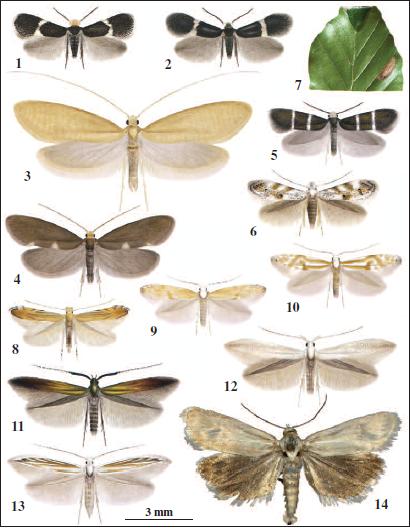 1. Ectoedemia atricollis (Stt.), 2. E. occultella (L.), 3. Nematopogon swammerdamella (L.), 4. Incurvaria vetulella (Zett.), 5. Phylloporia bistrigella (Hw.), 6. Bucculatrix frangutella (Gze.), 7. Parornix fagivora (Fry.), mine on Fagus sylvatica, 8. Phyllonorycter parisiella (Wck.), 9. Argyresthia dilectella Z., 10. A. abdominalis Z., 11. Coleophora variicornis Toll, 12. C. albidella ([D. & Schiff.]), 13. C. nubivagella Z., 14.Brachodes laeta (Stgr.).