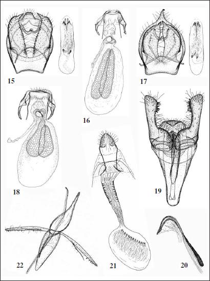 15-16. Ectoedemia atricollis (Stt.), male and female genitalia, 17-18. E. occultella (L.), male and female genitalia, 19. Incurvaria vetulella (Zett.), male genitalia, 20. Phylloporia bistrigella (Hw.), ovipositor, 21. Bucculatrix frangutella (Gze.), female fenitalia, 22. Phyllonorycter parisiella (Wck.), male genitalia.