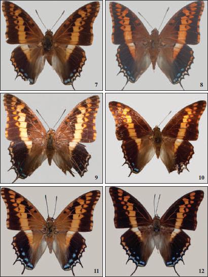 R of Charaxes saturnus saturnus Butler, 1865 from: 7. Nova Oeiras (BS-12771); 8. Satchijamba (BS-33313); 9. Huambo (CZ-2952); 10. Veríssimo Sarmento (BS-12773); 11. Lumeje (BS-12779); 12. Teixeira de Sousa (BS-12772).
