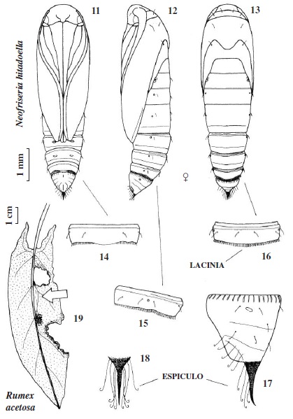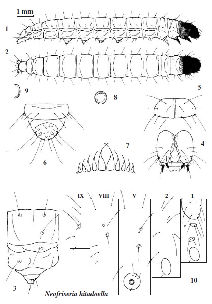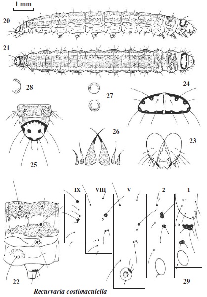 Una vez realizada la quetotaxia de Neofriseria hitadoella(fig. 10), se comparó con las especies ya estudiadas de su misma tribu: Mirificarma denotata Pitkin, 1984 (HUERTAS-DIONISIO, 2004); Mirificarmamulinella (Zeller, 1839), Gelechia senticetella(Staudinger, 1859) y Psoricopteragibbosella (Zeller, 1839) (HUERTAS-DIONISIO, 2012), observando que son muy parecidas, solo en el 9º urito, la seta L2 de hitadoella y senticetella, está girada hacia el interior, a diferencia de las otras especies, donde esa misma seta forma una línea recta con L1 y L3. Sobre la quetotaxia de Recurvaria costimaculella(fig. 29), también se comparó con las especies ya estudiadas de su tribu: Teleiodes albidorsella Huemer & Karsholt, 1999); Neotelphusa huemeri (Nel, 1998) (HUERTAS- DIONISIO, 2001), Carpatolechiadecorella (Haworth, 1812), Istrianis myricariella(Frey, 1870) y Teleiopsis diffinis (Haworth, 1828) (HUERTAS-DIONISIO, 2012), observando que la distribución de las setas es muy parecida, sólo se aprecia en el 9º urito, que las setas L1, L2 y L3 están giradas 90º en diffinis y las mismas setas en las otras especies forman un arco suave. La única diferencia notable entre estas especies es la presencia o no del expulsor de excrementos y su forma.