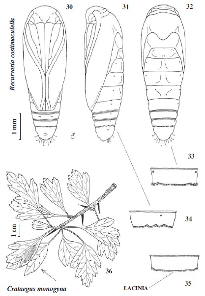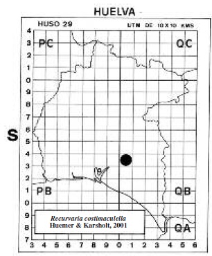 Recurvaria costimaculella Huemer & Karsholt, 2001, descrita de cuatro machos capturados en junio y julio de 1952 en Sicilia (Italia), siendo la hembra desconocida, así como sus plantas nutricias y sus primeros estados (HUEMER & KARSHOLT, 2001). Esta especie ha sido localizada en España, al observar varios Crataegus monogyna Jacq., en Valdemorales - Bonares (Huelva), con algunas hojas comidas y de distinto color, al retirar esas hojas unidas, se vieron pequeñas orugas rosáceas, las cuales se criaron, dando como resultado dos machos que salieron el 12 y el 17 abril 2002, como en la determinación de los adultos había dudas, se envió el macho nacido el día 12 de 2002 al Dr. Vives para su posible aclaración, y que una vez estudiado, determinó que pertenecía a esta especie y que resultaba nueva para la fauna de España (VIVES MORENO, 2014).